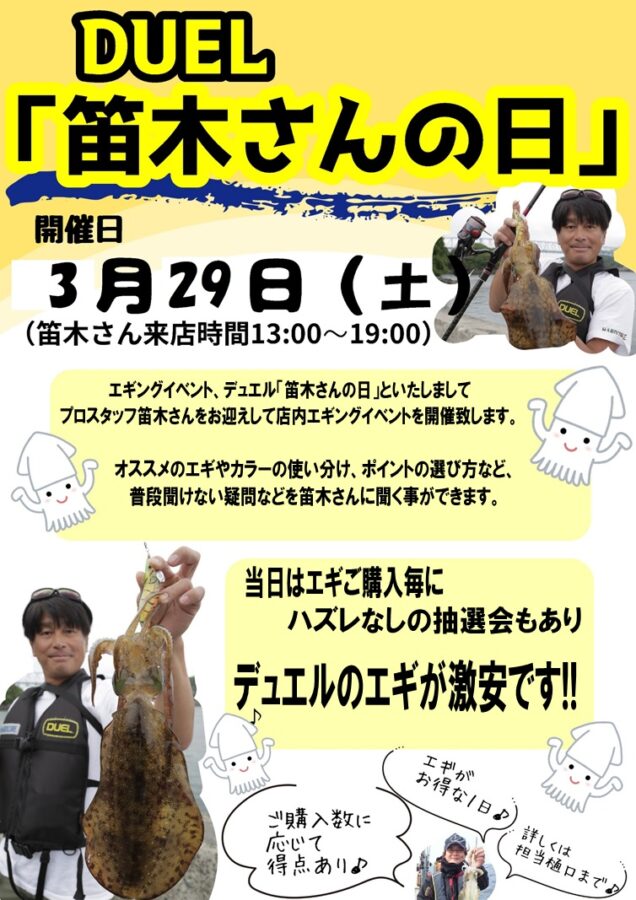 エギングシーンをリードする笛木プロが、エギングに関する皆様の疑問・質問に対し、店頭で直接アドバイス。