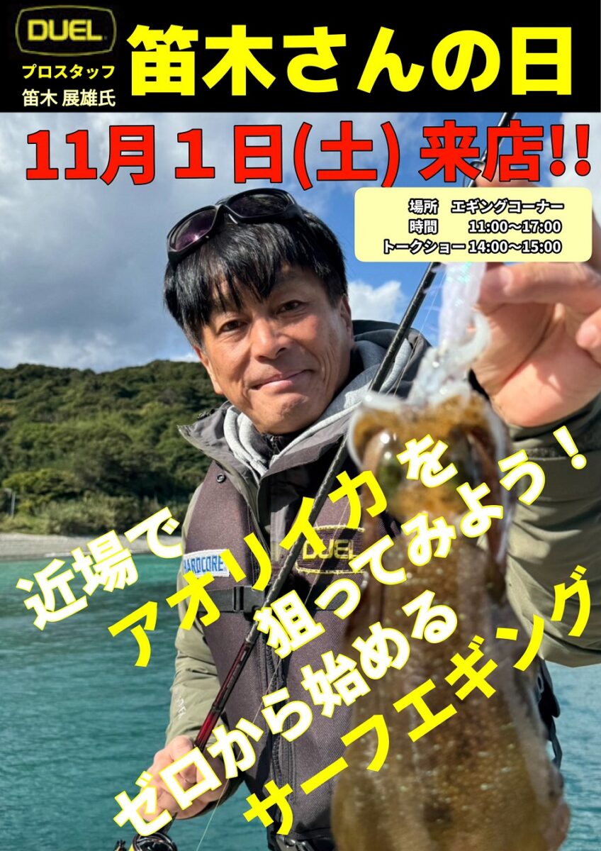 エギングシーンをリードする笛木プロが、エギングに関する皆様の疑問・質問に対し、店頭で直接アドバイス。