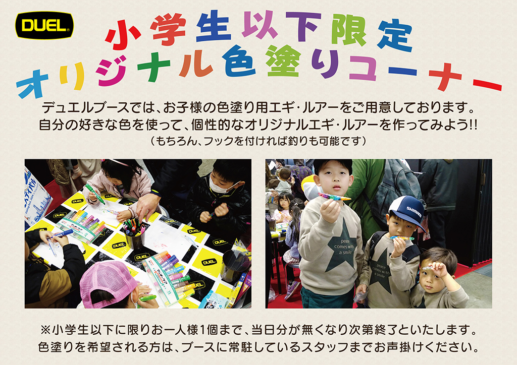 小学生以下限定、エギ・ルアー色塗りコーナー。塗り終わったエギ・ルアーはもちろんプレゼント!!