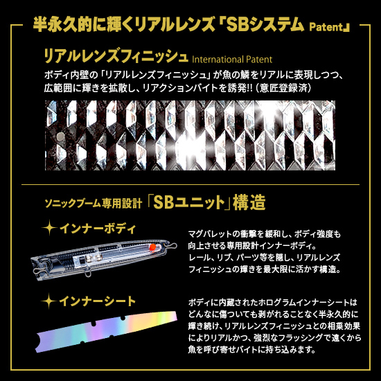 ボディに内蔵されたホログラムインナーシートはどんなに傷ついても剥がれることなく半永久的に輝き続け、リアルレンズフィニッシュとの相乗効果によりリアルかつ、強烈なフラッシングで遠くから魚を呼び寄せバイトに持ち込みます。 -