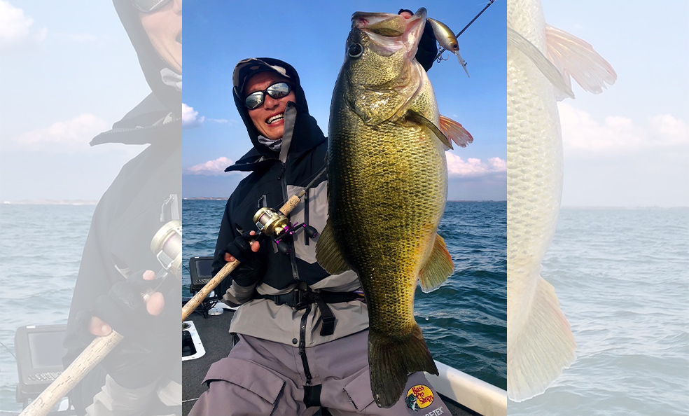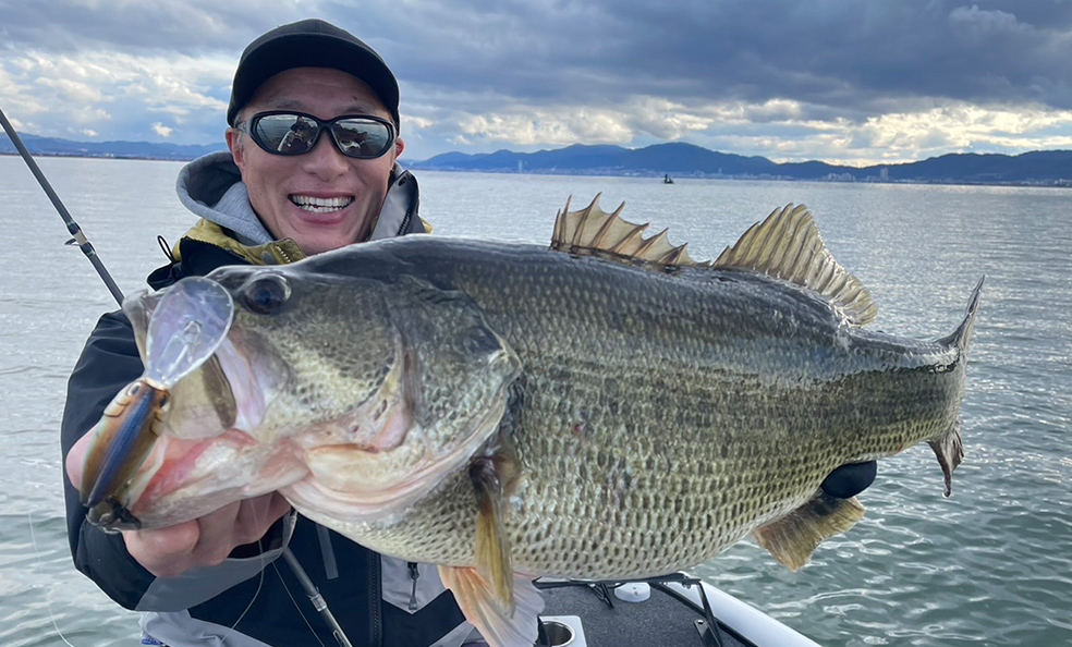 ① リップに搭載した透明ホログラムが、潜行時には太陽光を反射して遠くのバスにルアーの存在をアピール。