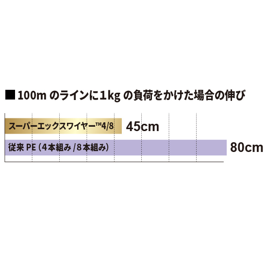 100mに1kgの負荷を加えた伸びは従来のPE86.3 cmに対しスーパーエックスワイヤーは44.4cm!!