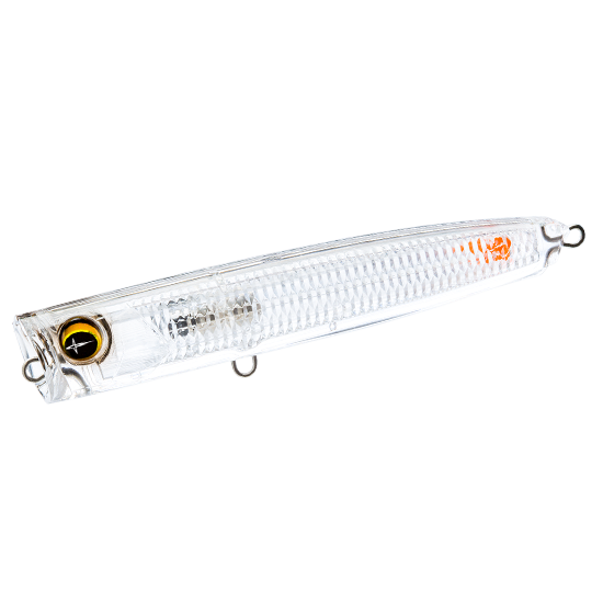 Features light-scattering hologram on the sides with a clear back and belly for light transmission. Creates random flashes of reflected and transmitted light, just like panicked baitfish. When targets are scarce and feeding on tiny baitfish, making them hard to pinpoint, this lure's powerful flash calls them in from a wide area, while its effect of clear color triggers a strike. -