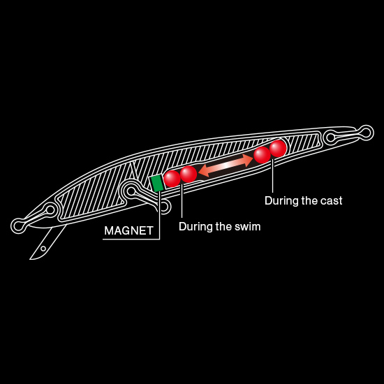 A powerful magnet ball in the belly securely fixes the weight for stable swimming performance.* The 50SF moving weight uses steel ball only.
