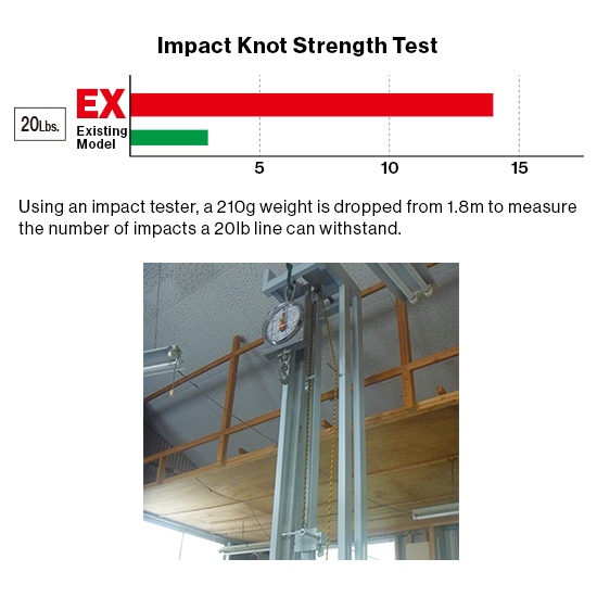 Using an impact tester, a 210g weight is dropped from 1.8m to measure the number of impacts a 20lb line can withstand.