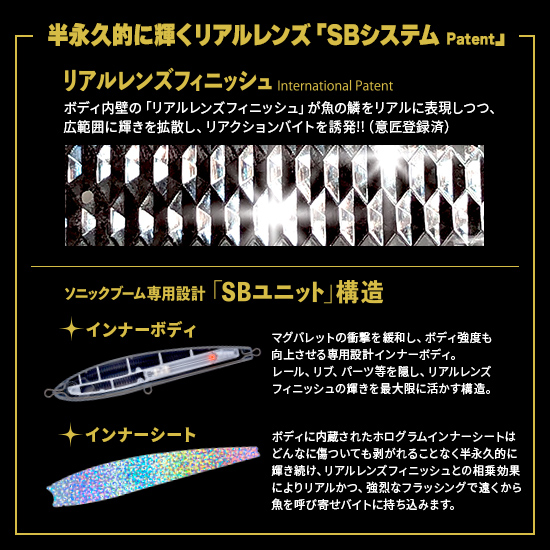 ボディに内蔵されたホログラムインナーシートはどんなに傷ついても剥がれることなく半永久的に輝き続け、リアルレンズフィニッシュとの相乗効果によりリアルかつ、強烈なフラッシングで遠くから魚を呼び寄せバイトに持ち込みます。 -