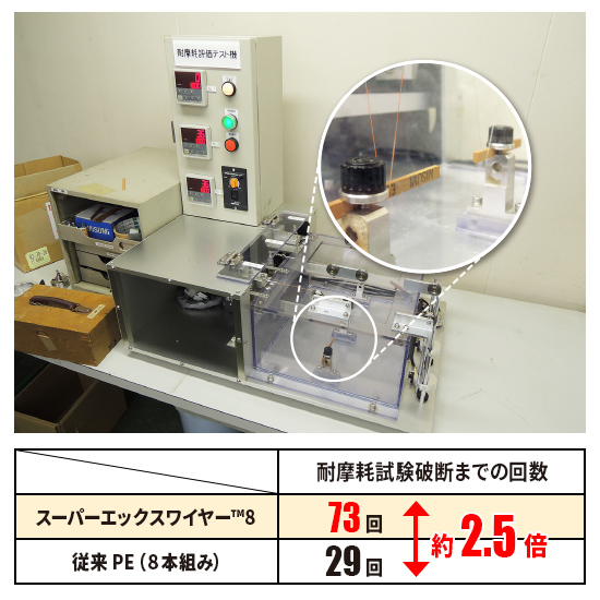 角ヤスリ(#800)に対し、鉛45gの負荷で一定速度繰り返し擦りつけ、1号のラインが破断するまでの回数を計測した結果、従来PEの約2倍の数値を計測。