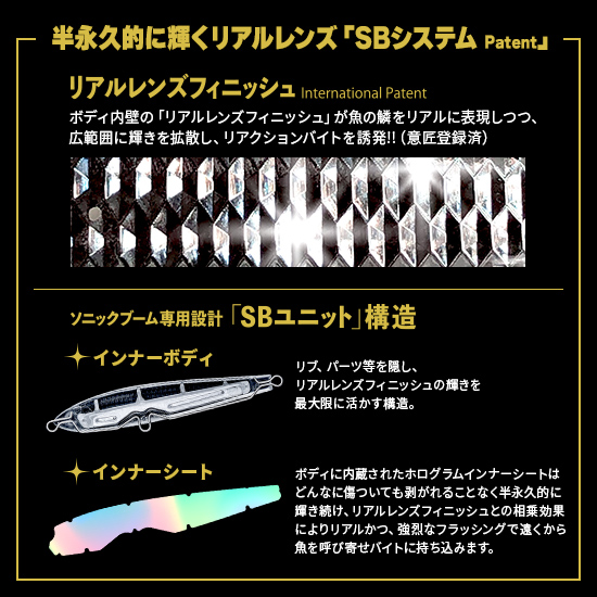 ボディ内壁の「リアルレンズフィニッシュ」が魚の鱗をリアルに表現しつつ、広範囲に輝きを拡散し、リアクションバイトを誘発!!(意匠登録済)