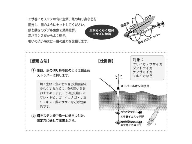 エサ巻イカスッテの背に生餌、魚の切り身などを固定し、図のようにセットしてください。